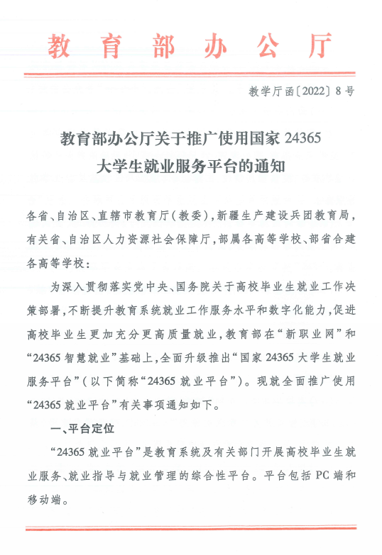 教育部办公厅关于推广使用国家24365大学生就业服务平台的通知